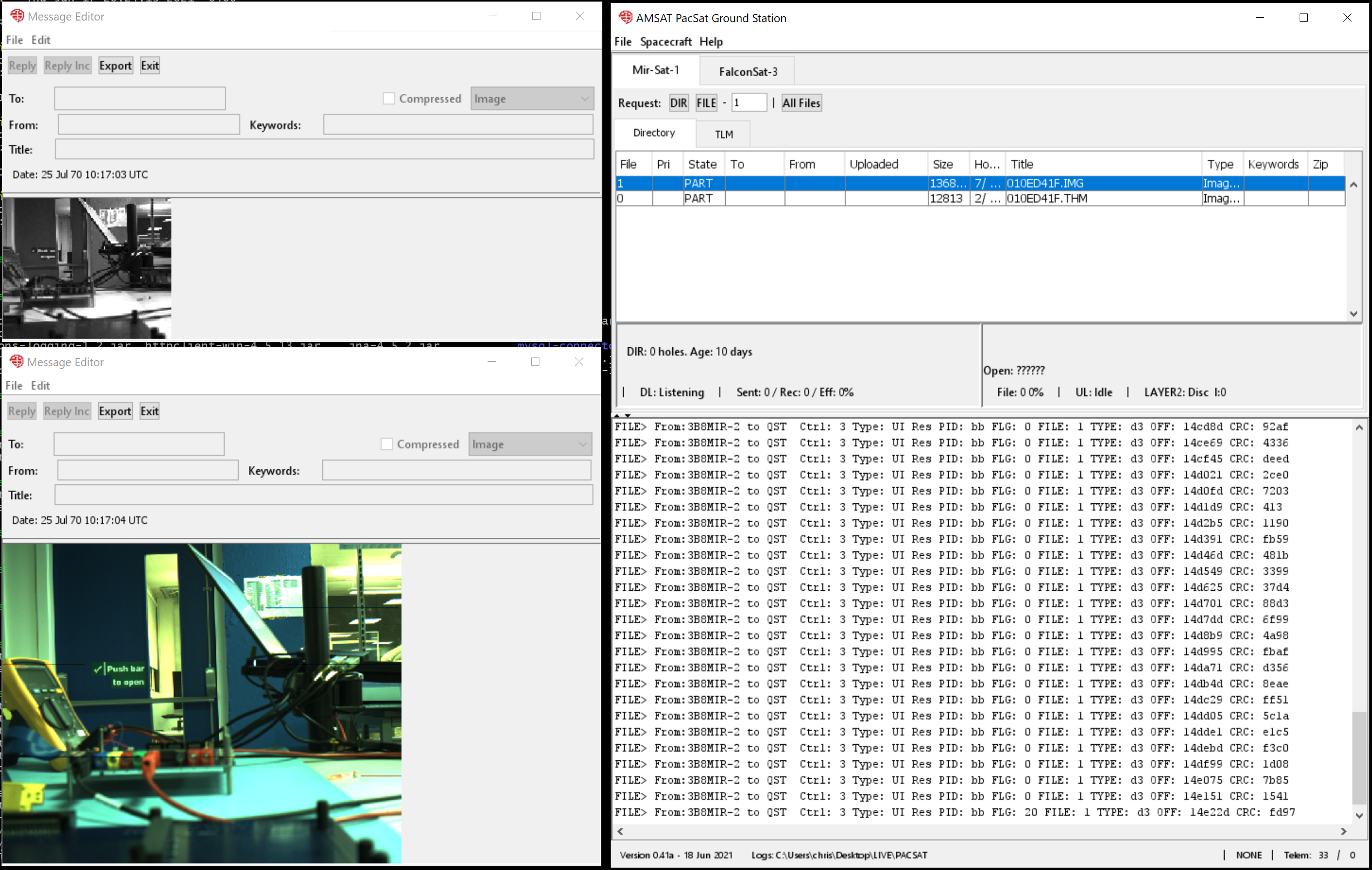 I have written a new version of the Pacsat Ground station for Mir-Sat-1. This will allow you to interact with the spacecraft to request a directory, mark files for download (automatically if you setup the right rules) and to receive files. It will also receive telemetry, forward it to SatNogs and store it in a local database on your machine for your own science projects. You can see example screen shots below showing two test files from the lab, one a small thumbnail and one a larger size.